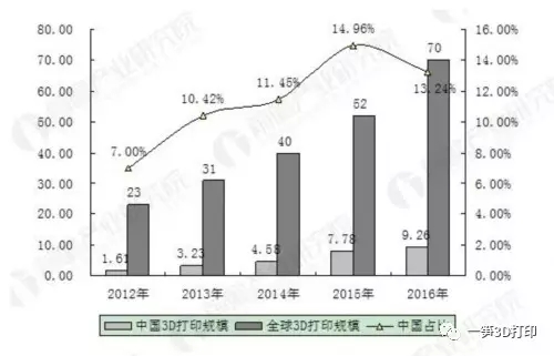 2012-2016年中国3D打印产业规模(单位:亿美元,%)