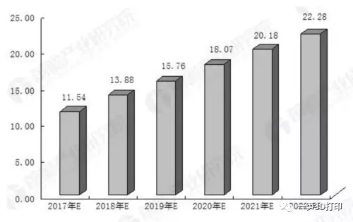 鉴于产业政策与财政政策的支持,初步预计,2017年我国3D打印市场规模可达到11.54亿美元,2022年达到22.28亿美元左右,年复合增长率约为38.61%。
