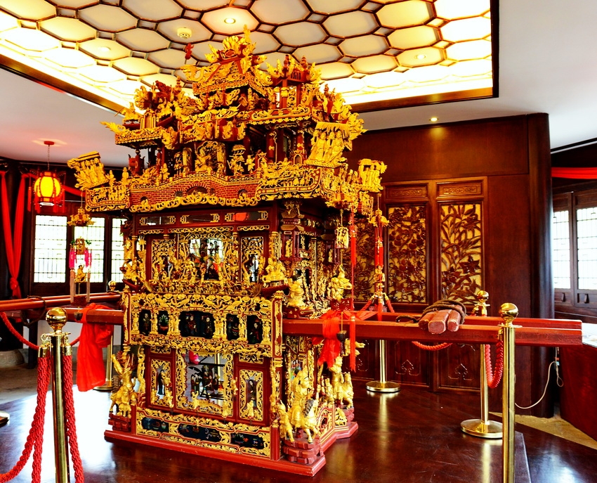 万工轿,也叫万工花轿,从名称上就可以理解,它比千工床复杂十倍。 朱金漆木雕的主色系是红色和金色