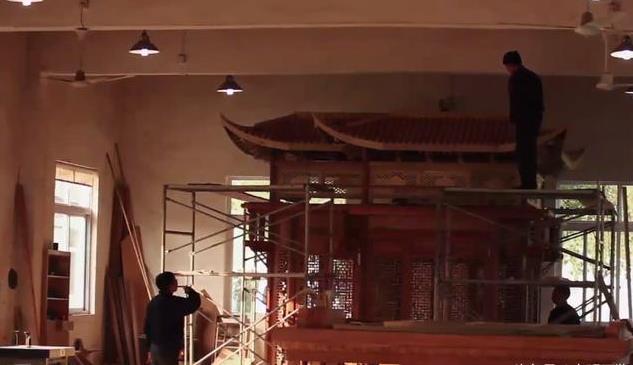 按照“三分雕七分漆”的说法,这顶万工花轿只完成了三成。要把所有的木配件组装起来,确定不再调整了,再逐一拆下髹漆。 ![]() 陈盖洪带领的朱金漆木雕团队,是国内唯一能复原万工轿的制作单位。 糙漆