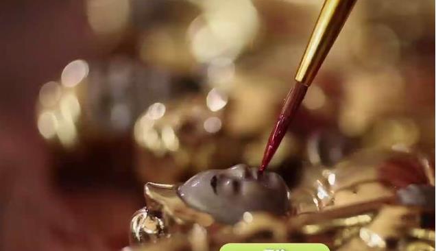 用排刷轻轻扫刷金箔,使其在木雕表面贴实,贴金的工序就完成了。
