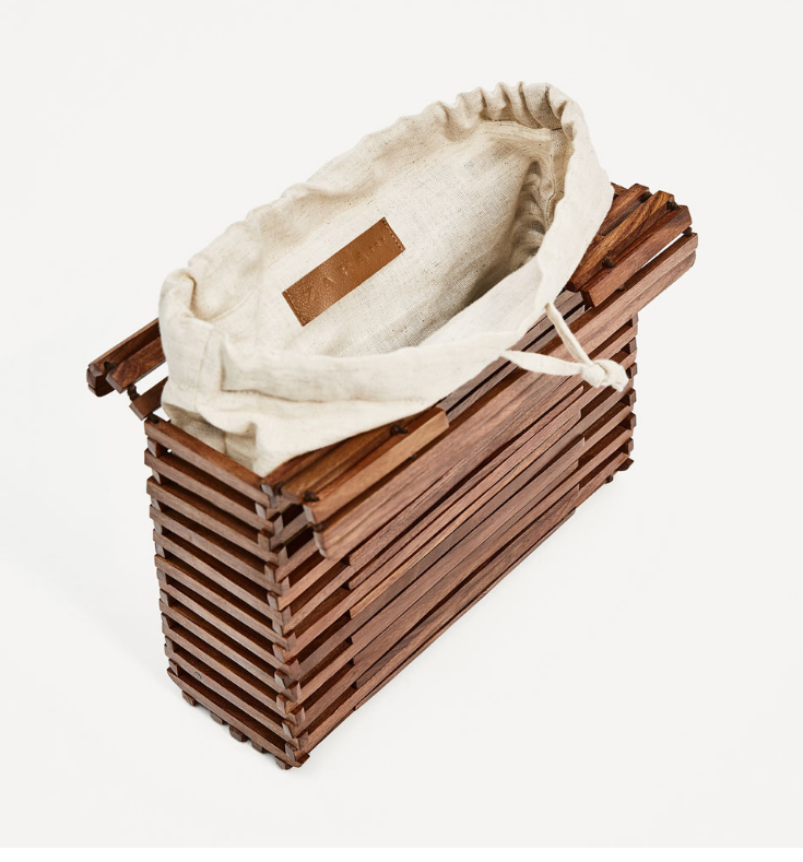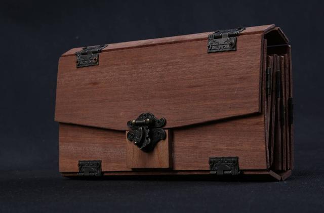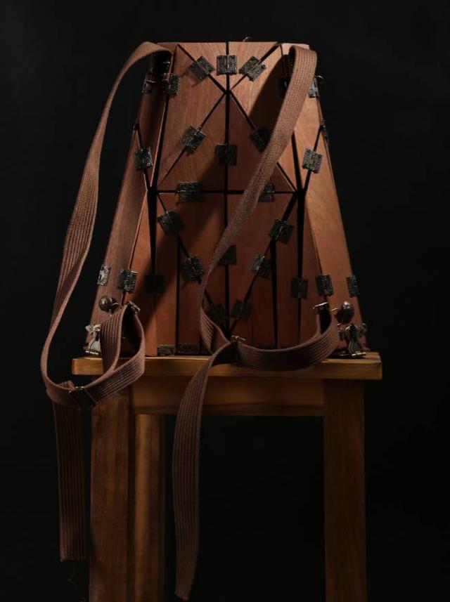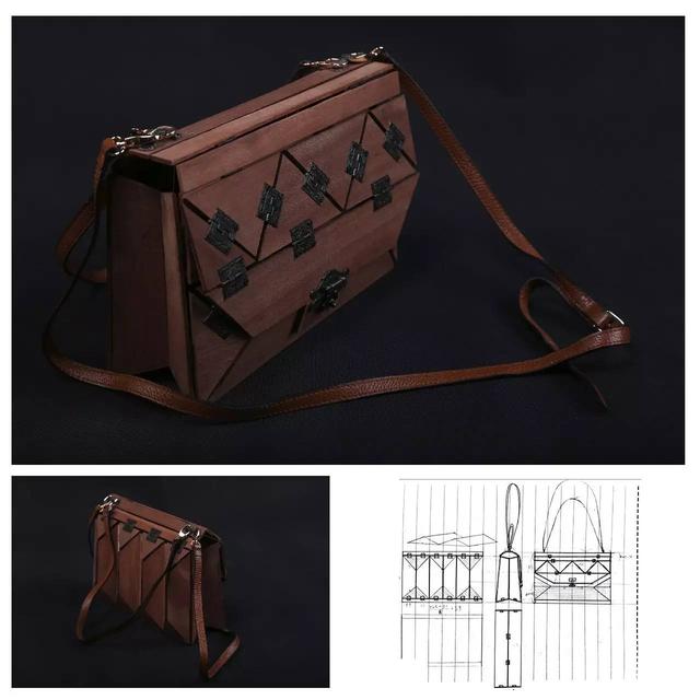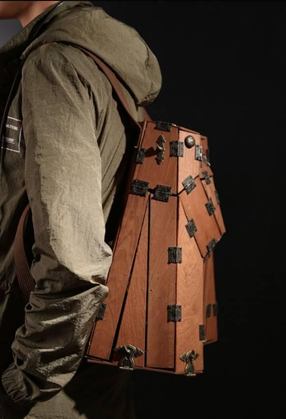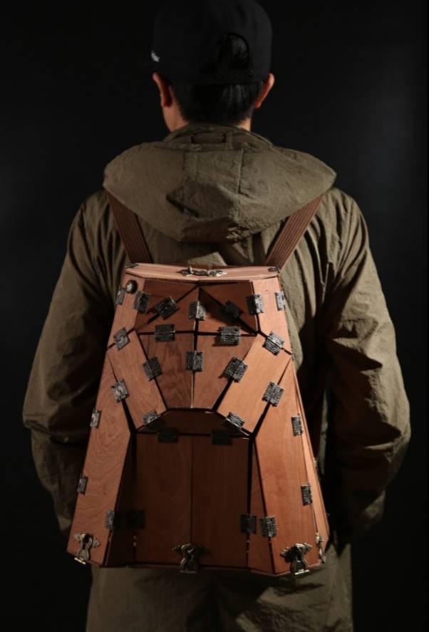 分片木制立体背包 这一套设计灵感来源于复杂的多面体与现代感的建筑外墙,通过反复的计算,用时1个月运用木板进行纯手工裁片,将木板运用合页衔接制作为一个背包,背包立体感强,通过对木板的解构,用合页组合完成整个设计。背包给人一种简约、复古、酷炫的感觉。