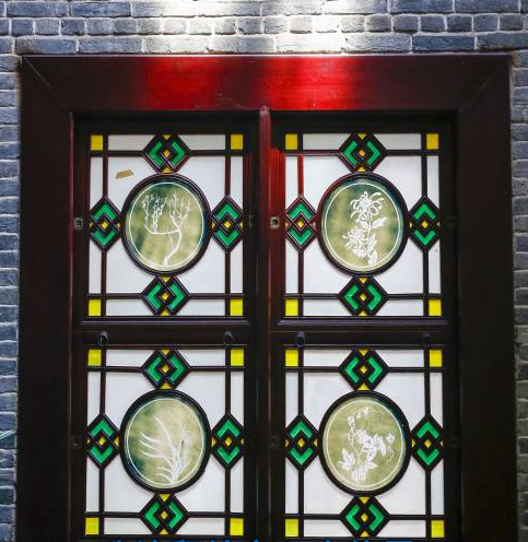 倒朝房(客房) 宾客的临时用房。家具陈列较为简单、随意。西关大屋的各路之间,用横门相通。横门上往往有横匾或砖雕之类的装饰,也有些是做成半圆形带蝴蝶图案窗棂的彩色玻璃窗,俗称“蝴蝶窗”,窗顶有半圆弧形的灰塑模线,很明显是受了西洋的影响。